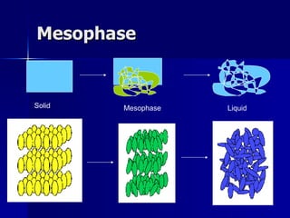 This document discusses liquid crystals and their use in liquid crystal displays (LCDs). It describes the different phases of liquid crystals including nematic, smectic, and cholesteric. Nematic liquid crystals are used in LCDs as they have anisotropic optical properties and can change the orientation of polarized light in response to electric fields. LCDs work by applying a voltage to change the tilt angle of the nematic crystals and control the transmission of light, allowing pixels to be switched on or off. Super-twisted nematic LCDs provide faster response times for grayscale images.