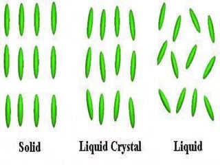 Liquid crystals are a state of matter with properties between liquids and solids, first examined by Friedrich Reinitzer in 1888. They are classified into thermotropic and lyotropic types, with phases including nematic and smectic, and can be influenced by temperature, pressure, and electric fields. The nematic phase is predominantly used in LCD technology and other applications such as thermometers and protective gear.