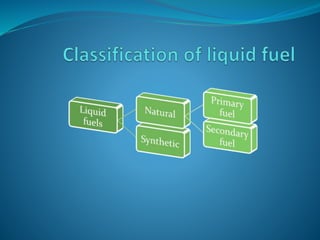 Liquid fuels can be broadly classified into natural and manufactured fuels. Petroleum, obtained by drilling wells, is the largest source of natural liquid fuel and is refined to produce fuels like gasoline, diesel, kerosene and heavy fuel oil. Synthetic liquid fuels can be manufactured from coal, natural gas or biomass through processes like Fischer-Tropsch. Other liquid biofuels include biodiesel, produced from vegetable oils, and alcohol fuels like ethanol produced by fermenting biomass. Each fuel has different properties and characteristics making some more suitable for specific applications like diesel in compression ignition engines.