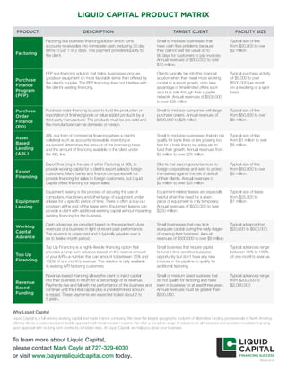 This document provides descriptions of various capital financing products offered by Liquid Capital including factoring, purchase order financing, asset-based lending, export financing, equipment leasing, working capital advances, top up financing, and revenue-based funding. It outlines the target clients and typical funding amounts for each product, with factors like company size, industry, and annual revenues determining eligibility. Liquid Capital aims to offer customized and flexible working capital solutions to businesses across North America through a network of local professionals.