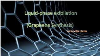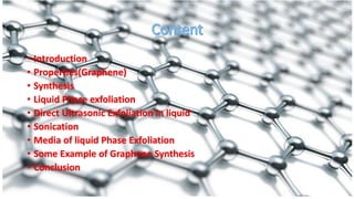 The document discusses various methods for synthesizing graphene, with a focus on liquid phase exfoliation. It describes how liquid phase exfoliation involves ultrasonically exfoliating graphite in liquid media such as organic solvents or ionic liquids. Direct ultrasonication can influence the exfoliation yield, depending on energy input and the liquid media used. Sonication applies sound energy to agitate particles and is usually done with an ultrasonic bath or probe. Common solvents for liquid phase exfoliation include NMP and DMF. Low boiling point solvents like isopropanol and chloroform have also shown success. Liquid phase exfoliation has advantages such as being economical and scalable compared to other methods