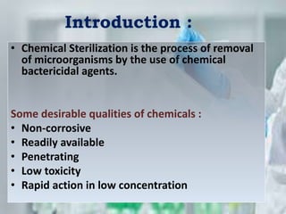 This document discusses various chemical sterilization methods. It outlines desirable qualities for chemical sterilizing agents and describes commonly used chemicals like alcohol, phenol, aldehydes, and halogens. Specific phenol derivatives and aldehydes used for sterilization are explained in more detail. The advantages of chemical sterilization include being relatively quick and painless compared to surgery, while disadvantages include potential side effects and not completely eliminating hormone-related health risks.