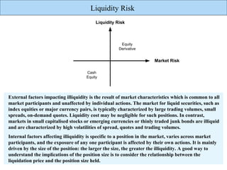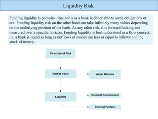 The document discusses liquidity risk, which can be defined as a bank's ability to meet its short-term obligations. It is measured over a specific time horizon and depends on factors like a bank's cash inflows and outflows. Liquidity risk is affected by both external market characteristics and internal factors specific to a bank's positions. Reporting on liquidity risk involves reconciling accounting and liquidity data, projecting contractual cash flows, and analyzing liquid assets, funding sources, and leading indicators of liquidity issues.