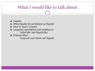 This document summarizes research on liquid-like thin films conducted by Alokmay Datta and collaborators. Key points include: