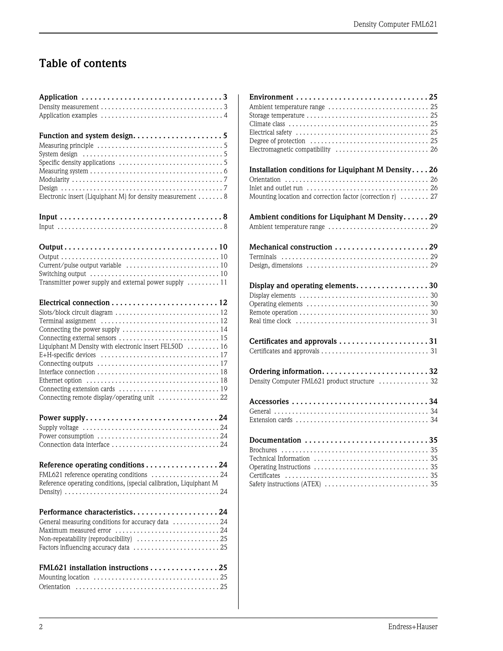 The document provides technical information about the Liquiphant M density measurement system with the FEL50D electronic insert and FML621 density computer, designed for hazardous areas and liquid media applications. It outlines the system's capabilities, including continuous density measurement, concentration calculation, and unit conversions, as well as various sensor options and benefits such as maintenance-free operation and hygienic compliance. Additionally, it discusses installation requirements, environmental considerations, and application examples for industries, including chemical and food sectors.