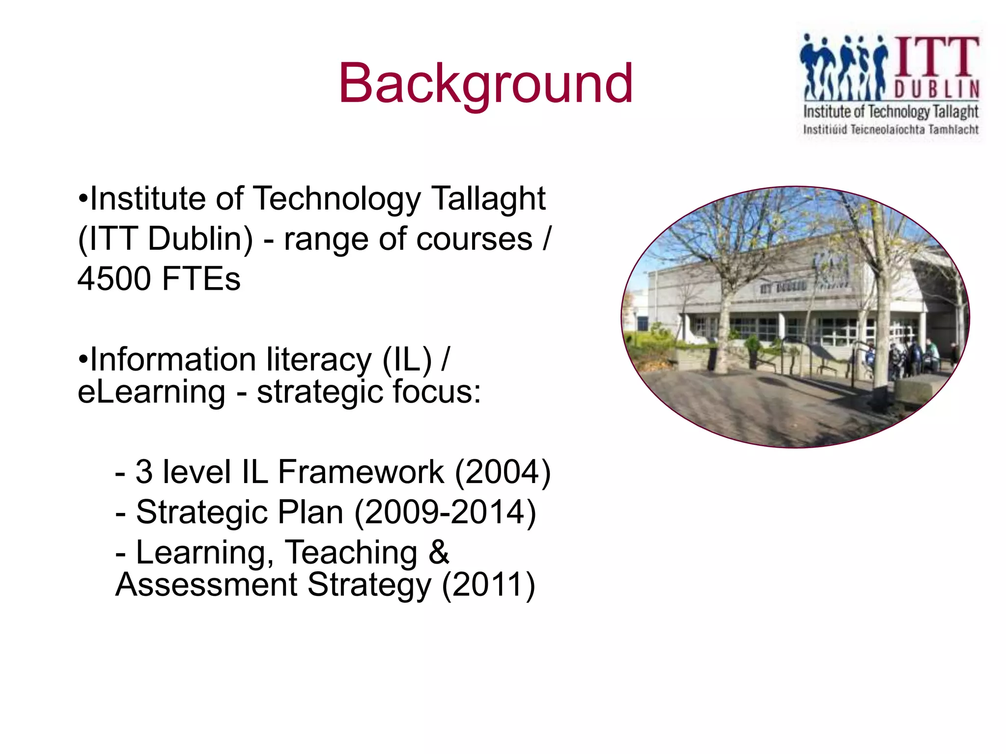 The document outlines best practices for designing and sharing reusable learning objects, particularly focusing on information literacy at the Institute of Technology Tallaght. It discusses the creation of self-paced online tutorials aimed at enhancing students' academic skills and critical thinking, supported by extensive planning, usability testing, and integration into academic modules. Feedback shows improved competencies among students, highlighting the value of accessible online resources for transitioning into higher education.
