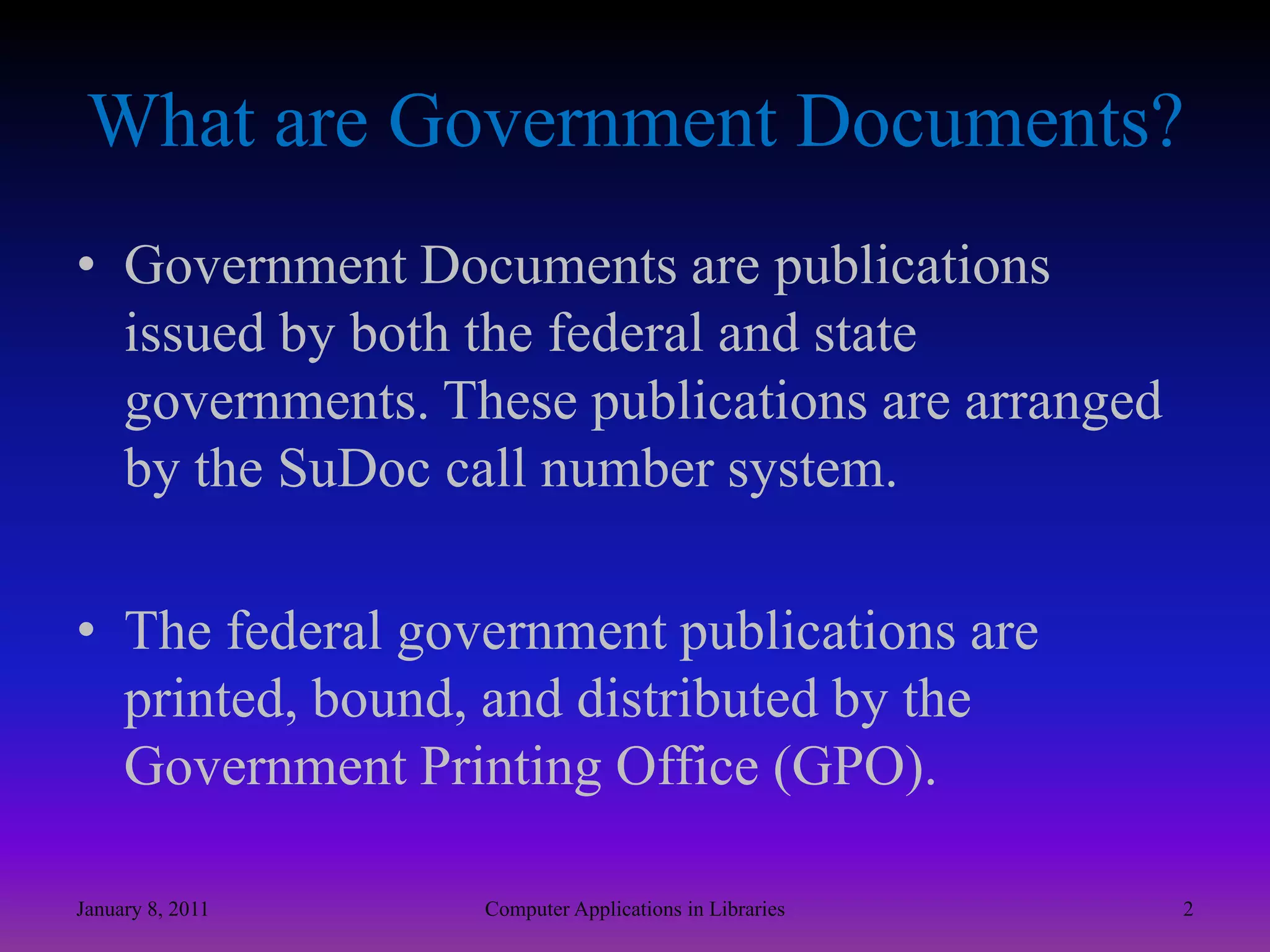 Government documents are publications issued by federal and state governments that are organized using the SuDoc call number system. The federal government printing office (GPO) prints and distributes most federal publications. The SuDoc call number divides publications into departments and sub-agencies identified in the stem and individual publication numbers identified after the colon. Most government agencies now make publications available online in addition to printed versions distributed to depository libraries.