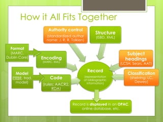 This document discusses how various knowledge organization systems work together, including records, codes, encoding, authority control, structure, subject headings, classification, and models. It then covers core concepts of controlled vocabularies like organizing terms to label and find content. Different approaches to controlled vocabularies are described like pre-coordinate versus post-coordinate systems. The document outlines various types of controlled vocabularies and how they are arranged. It also discusses issues in constructing controlled vocabularies and provides examples of terminology used in thesauri and concept maps.