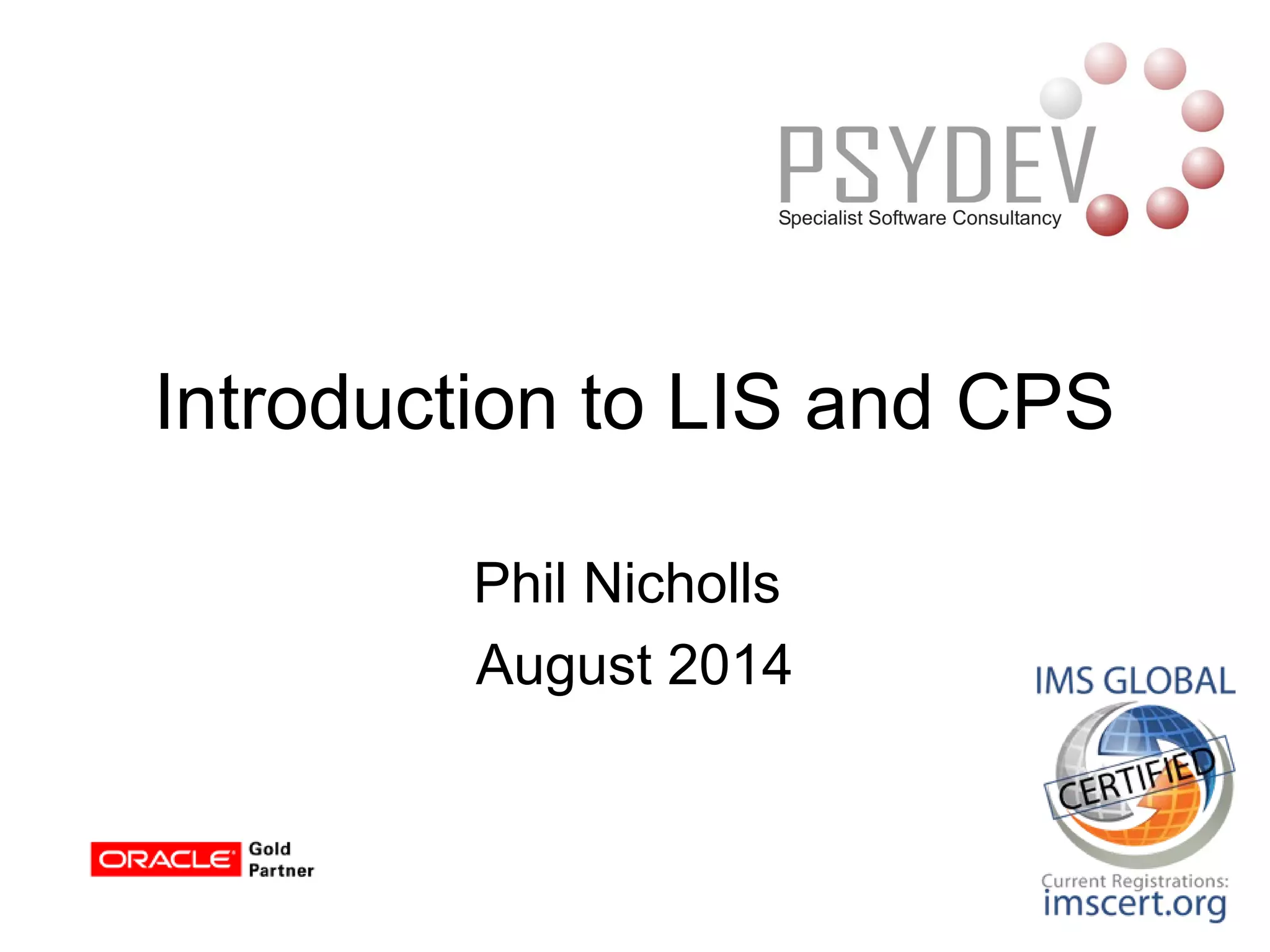 The document introduces Phil Nicholls and his background working with interoperability standards, and provides an overview of the Learning Information Services (LIS) and Course Planning and Scheduling (CPS) specifications. LIS allows different systems like student information systems and learning management systems to exchange student data in a standard way, while CPS extends LIS to also exchange scheduling data between systems. The specifications were developed by IMS Global to facilitate integration between education technology systems and avoid point-to-point integrations.
