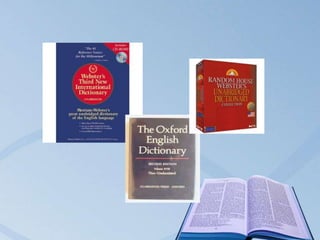 A dictionary is a book or electronic resource that contains words of a language arranged alphabetically along with explanations of their meanings and other information. It provides definitions, pronunciations, etymologies, and other details about words. Dictionaries come in different types, including unabridged dictionaries which are the most comprehensive and contain over 265,000 words, and abridged dictionaries which focus on common words and contain 150,000 to 250,000 words. Dictionaries are used to define, translate, verify spelling and pronunciation of words, determine their origins, and standardize language usage.