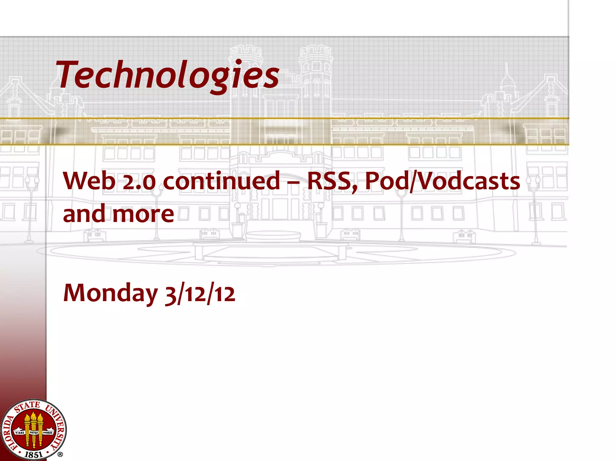 The document discusses technologies like RSS, podcasts, and social media. It provides information on RSS, including what RSS is (Real Simple Syndication), how it allows aggregating web content in one place, and examples of news and academic sites that use RSS feeds. The document also discusses podcasting, defining it and describing how it can be used for things like distance learning and mobility. Finally, the document outlines a group assignment for students to create a website and marketing plan about using social media to promote an academic discipline.