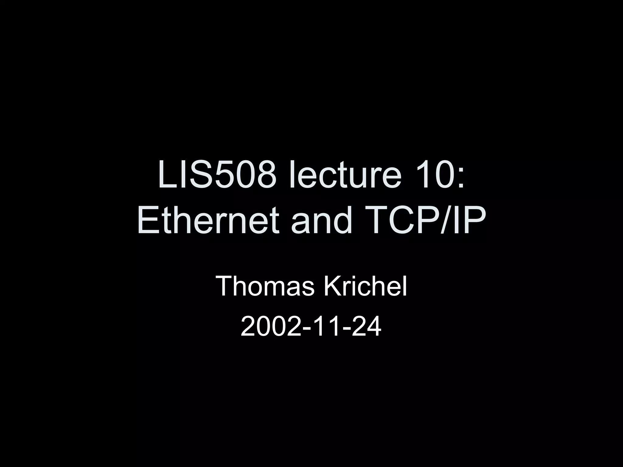 The document summarizes the history and development of Ethernet and TCP/IP networking protocols. It describes how ARPANET originally used packet switching in the 1960s, the development of TCP and IP in the 1970s, and how Ethernet was implemented as a standard for local area networks. It also provides an overview of how IP, TCP and common applications like HTTP operate and interconnect across network layers.