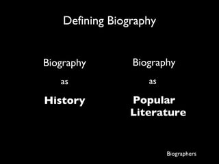 The document discusses research into the information seeking behaviors of scholarly biographers versus popular biographers. It reviews previous literature that found biographers use a wide variety of resources, including archives, manuscripts, books and websites. The study aims to understand if biographers' methods differ based on whether they intend to publish academically or popularly. Surveys and interviews were conducted, finding that both groups are motivated to publish, but scholarly biographers engage more with other researchers while popular biographers focus on book publications.