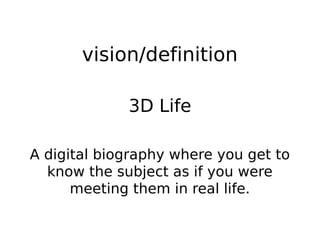 This document proposes the concept of a "3D Life", which is a digital biography that allows the reader to get to know the subject as if meeting them in real life. It then discusses using William Hayley as the subject, noting that he was an innovative biographer and poet, though of limited interest today due to limited surviving information about his life. The document outlines elements of the proposed 3D Life format, including biographical information about Hayley, commentary and opinions from the author and others, and a non-linear narrative structure that allows the reader to navigate Hayley's life and connections to other people through varied media and sources.