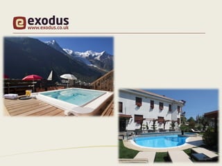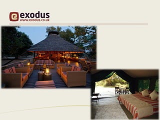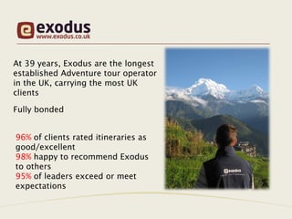 Exodus is the longest established adventure tour operator in the UK, carrying the most UK clients. They offer a variety of guided trips centered around walking, cycling, and other outdoor activities across 6 continents. Trips are graded based on difficulty and range from leisurely to challenging. Client reviews show high rates of satisfaction, with 96% rating itineraries as good or excellent and 98% recommending Exodus to others.