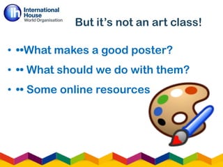 The document provides guidance on creating effective posters for language learning classes. It asks questions about what makes a good poster, how to get students engaged in the process, and how to ensure they are producing language. Some tips include providing clear instructions and feedback, setting roles for group work, and finding ways to reuse the posters later, such as for error correction. The document also shares some online tools that can be used for creating digital posters and gives ideas for follow-up activities to further learning.
