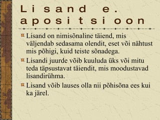 Lisand e. apositsioonLisand on nimisõnaline täiend, mis väljendab sedasama olendit, eset või nähtust mis põhigi, kuid teiste sõnadega. Lisandi juurde võib kuuluda üks või mitu teda täpsustavat täiendit, mis moodustavad lisandirühma. Lisand võib lauses olla nii põhisõna ees kui ka järel.