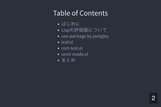 Yet another use-package - Simplify Elisp unit test framework - Major-mode for editing SEML files - Parallel thread modern Emacs package manager 参考資料 東京大学- Paren-holic - STUART C. SHAPIRO - Harold Abelson 他著和田栄一訳- Richard Stallman 他著Ayatakesi 訳- Github leaf.el cort-test.el seml-mode.el feather.el Twitter ソフトウェア第三講義資料- Lisp処理系, リスト処理 3つのLisp 3つの世界 Common lisp - An Interacive approach 計算機プログラムの構造と解釈 GNU Emacs Lisp Reference Manual 9 . 2