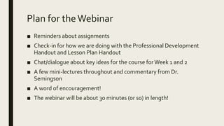 2) An overview of the planned webinar content which will include reminders about assignments, checking in on student progress, mini-lectures and commentary from the instructor, and a word of encouragement.