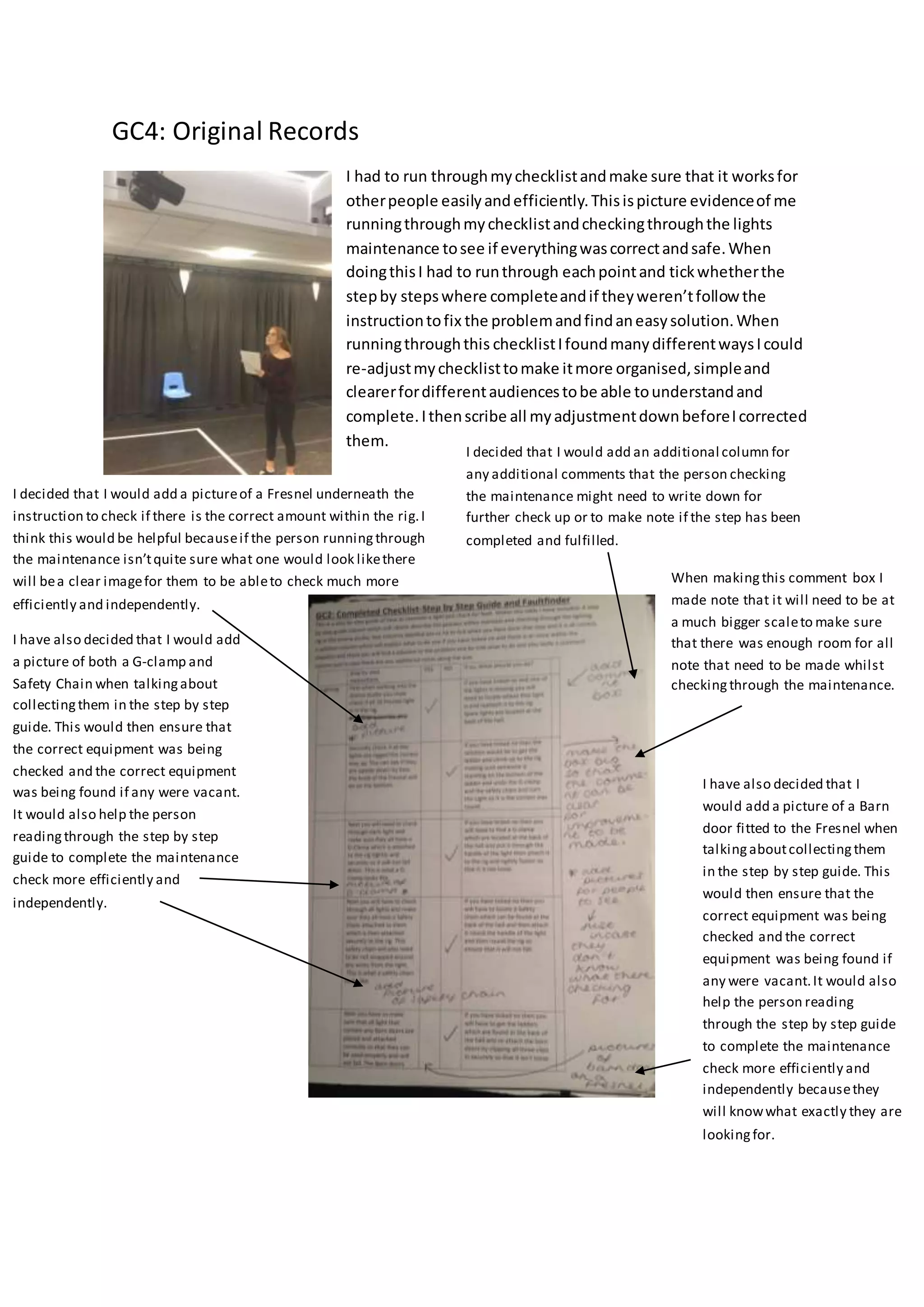 The document describes changes and additions the author plans to make to improve a technical maintenance checklist for stage lighting. Some key points: