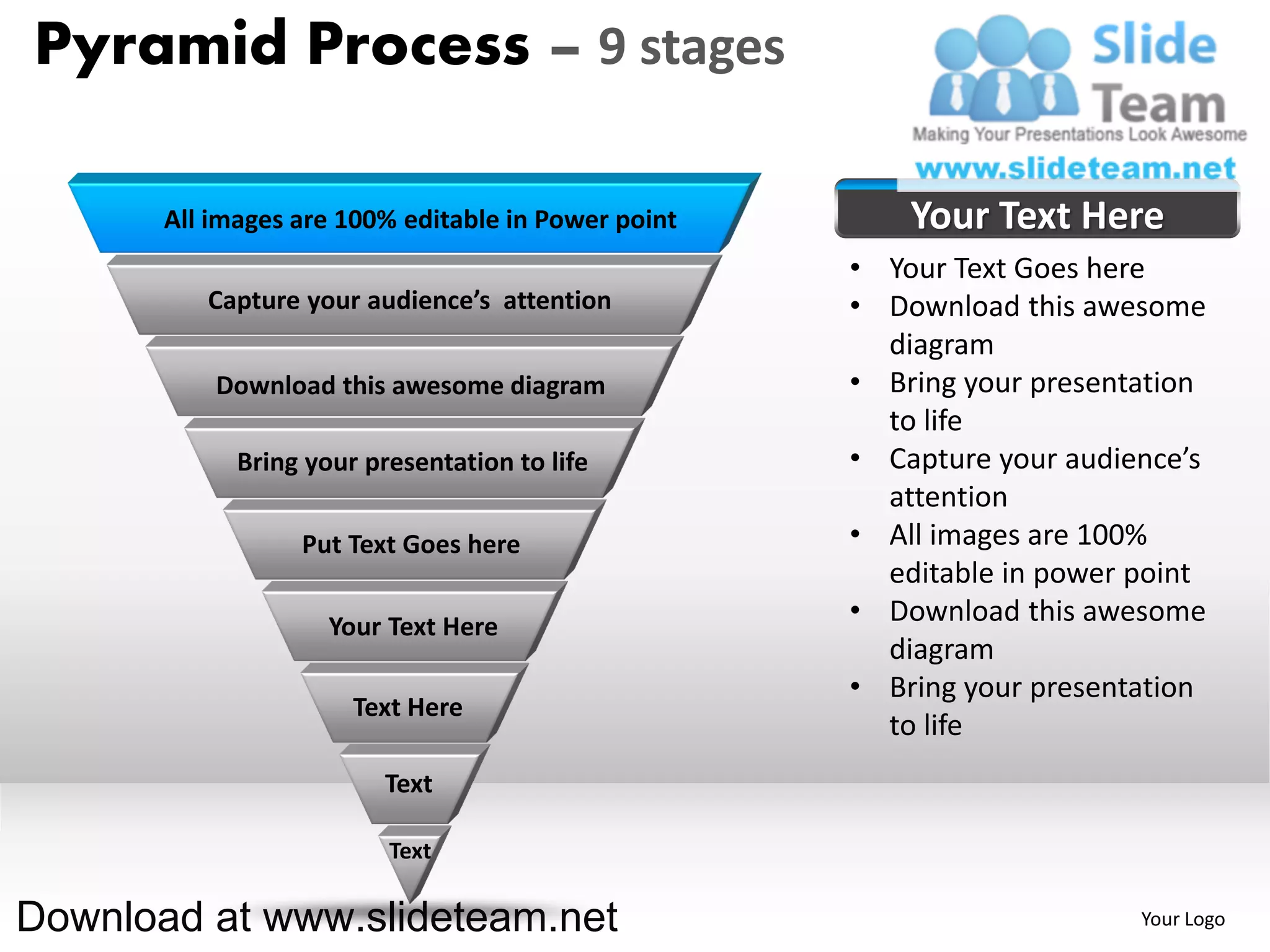 The document describes a pyramid process with 9 stages for creating a presentation. It includes instructions to capture the audience's attention, download and edit diagrams, add text in various places, and bring the presentation to life. The diagrams can be fully edited in PowerPoint. Additional text and formatting options are listed in each step.