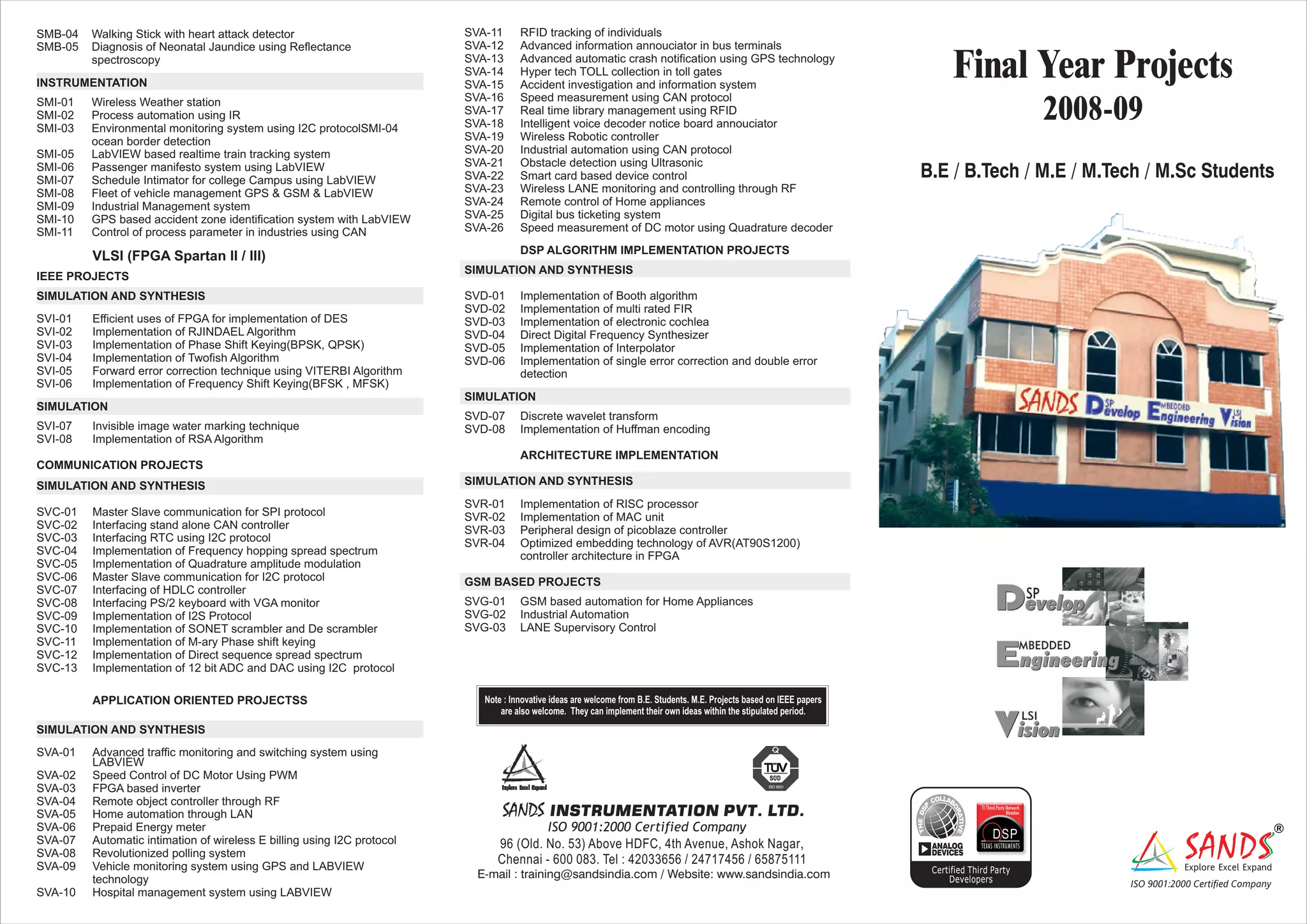 This document lists various final year projects for students in areas like instrumentation, communication, VLSI, DSP algorithm implementation, architecture implementation, GSM based projects, and application oriented projects. The projects cover topics such as wireless weather stations, process automation, RFID tracking systems, intelligent transportation systems, home automation, industrial automation, and more. Many involve implementing technologies like LabVIEW, GPS, GSM, RFID, and focus on practical applications.