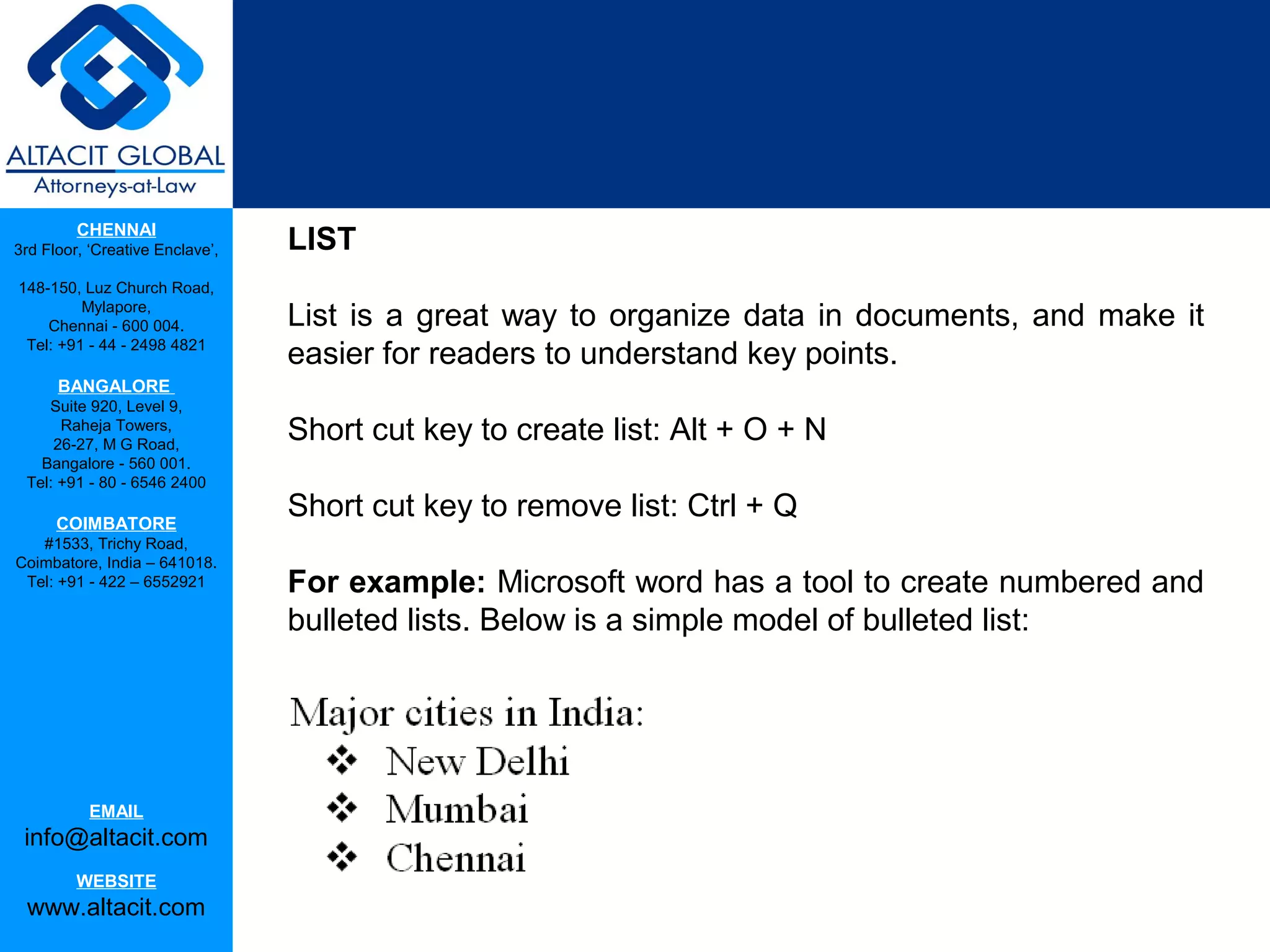 This document discusses how to create and format lists in Microsoft Word. It describes the two types of lists - ordered and unordered lists, and how to create them using shortcut keys. Multi-level lists and sorting lists in ascending or descending order are also covered. Contact and location details for Altacit offices in Chennai, Bangalore and Coimbatore are provided.