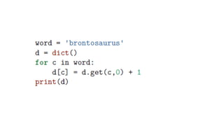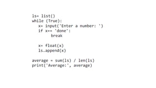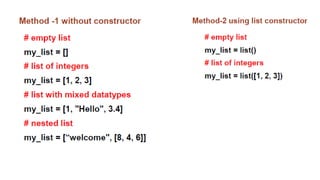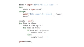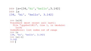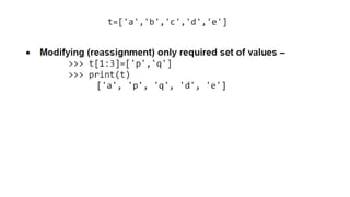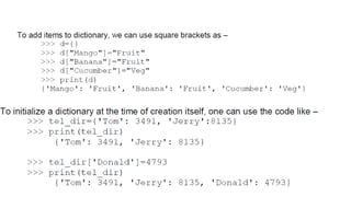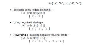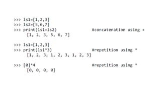 This document provides an overview of lists, dictionaries, and tuples in Python. It covers list creation, manipulation methods, and operations such as slicing, concatenation, and membership checking, alongside dictionary characteristics and usage examples. Additionally, it contrasts lists and strings, explains tuples, and introduces basic text parsing techniques.