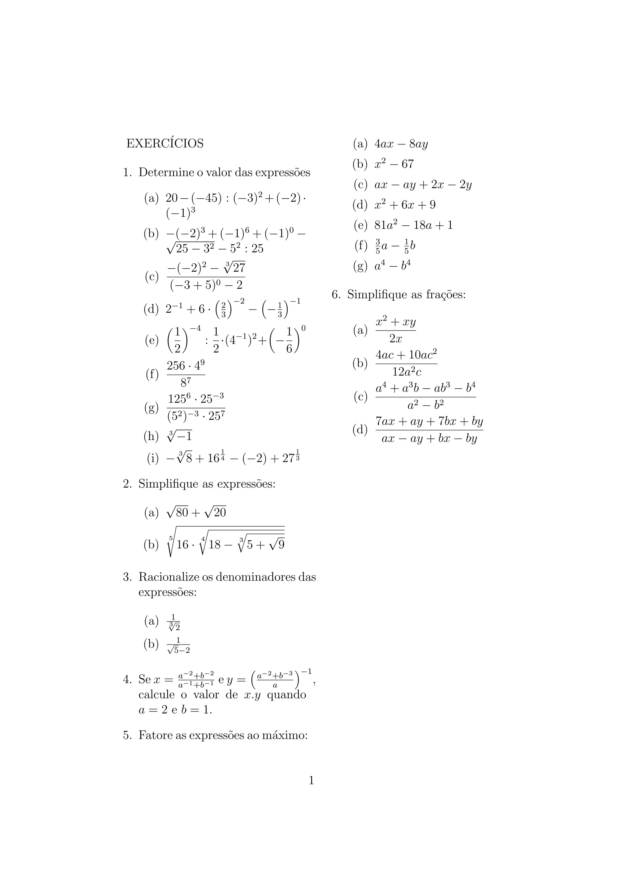The document contains a series of math problems involving simplifying expressions, rationalizing denominators, factoring expressions, and simplifying fractions. It provides the problems and then lists the answers. Some of the problems include determining the values of expressions, simplifying radicals, factoring quadratic expressions, and calculating a value when given values for variables.