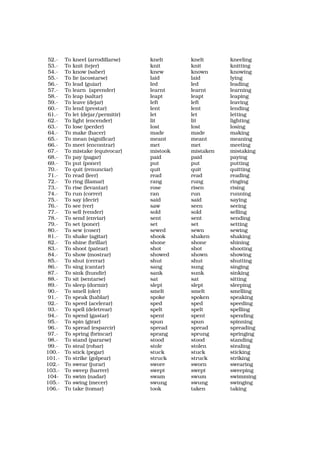 The document lists the conjugations of irregular and regular verbs in English. For irregular verbs, it provides the infinitive form, past tense, past participle, and gerund form. For regular verbs, it only provides the infinitive, past tense, and gerund form. There are over 100 verbs listed in each category. The document serves as a reference for the conjugations of common English verbs.