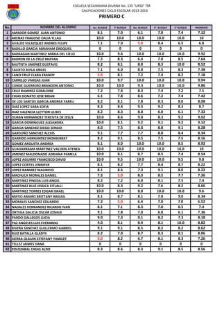 This document contains a table listing the names of 42 students from the daytime secondary school No. 135 "URSS" along with their grades in 5 blocks and their average grade for the school year 2013-2014. For each student, their grades for each block range from 0 to 10, and their average grade is calculated and displayed in the final column. The table shows the distribution of grades achieved by students across the 5 grading blocks and on average for the school year.