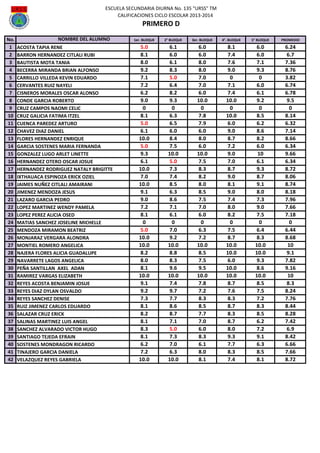 This document contains the grades of 42 students across 5 grading periods for an unspecified class or classes. It lists each student's name and their grades on a scale of 0 to 10 for each grading period, as well as their overall average grade. The highest average was a perfect score of 10 by two students. Grades ranged from 0 to 10 across the periods.