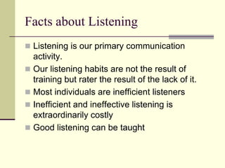 The document discusses receiving skills and listening. It describes the six components of listening as hearing, attending, interpreting, evaluating, remembering, and responding. Various styles of receiving information are presented, including non-listening, pseudo listening, defensive listening, appreciative listening, listening with empathy, and others. Factors that influence effective listening are discussed, such as listening being learned first but taught least. Keys to effective listening include finding areas of interest, judging content over delivery, holding judgment until comprehension is complete, listening for ideas, being a flexible note taker, working at listening, resisting distractions, exercising the mind, keeping an open mind, and using thought during listening.
