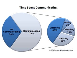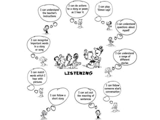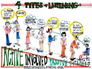 This document discusses effective listening skills. It defines listening as an active mental process that requires focus and effort, unlike passive hearing. Good listening skills are important for communication, relationships, conflict resolution and career success. The document outlines barriers to listening like distractions. It recommends active listening techniques like reflecting and paraphrasing to ensure understanding. Effective listening takes practice to overcome natural tendencies to plan responses rather than focus on the speaker.