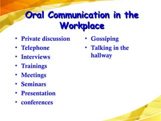 This document discusses listening in the workplace. It identifies different types of oral communication that occur in workplaces, such as meetings, presentations, and trainings. The listening process involves receiving a message, interpreting it, remembering it, evaluating it, responding to it, and acting on it. Barriers to effective listening include mental barriers like prejudgment and selective listening. The document provides tips for improving listening, such as preparing, avoiding distractions, and asking clarifying questions. Common barriers to listening are also identified, as well as the most irritating listening habits.
