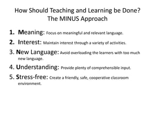 This document provides guidance on effective listening instruction and activities. It recommends the MINUS approach: focus on meaning, interest, manageable new language, understanding, and a stress-free environment. Suggested activities include listening to stories, cloze exercises, picture ordering, and information transfer tasks. Dictation and dictogloss activities are also discussed, along with developing fluency, assessment, and online listening resources. The document emphasizes selecting meaningful, level-appropriate materials and supporting comprehension through pre-listening activities and cooperative learning.