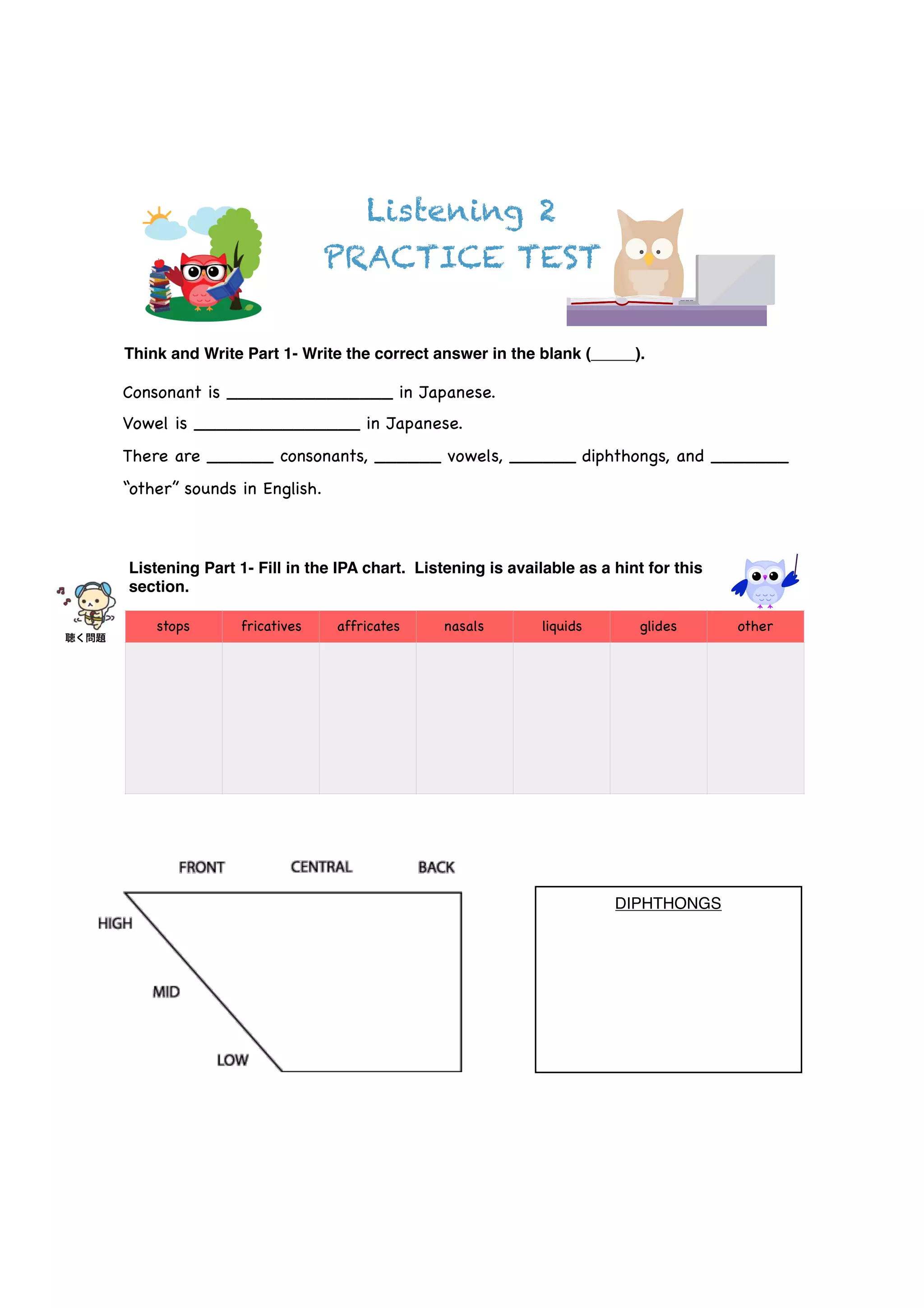 This document provides listening practice for Japanese learners of English. It includes exercises to fill in phonetic charts with consonant and vowel sounds, identify rhyming words, transcribe words and phrases into phonetic transcription using the International Phonetic Alphabet, and note syllable patterns and reductions. The exercises help learners improve their ability to perceive and produce English sounds.