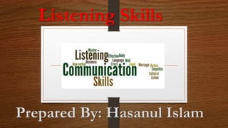 3. Types of listening include discriminative listening which focuses on specific sounds, marginal listening which focuses on important parts while neglecting additions, and projective listening which matches the listener's ideas to the speaker's message. Active listening incorporates full attention and feedback.