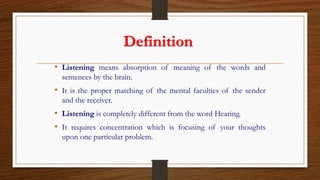 1. Listening involves hearing words and sentences and properly matching the mental faculties of the sender and receiver, requiring concentration.