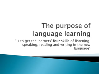 The document discusses the four main language skills of listening, speaking, reading, and writing that are important goals in language learning. It focuses on listening skills, describing listening as the ability to accurately receive messages. It provides tips for teachers on preparing, engaging, and following up with students during listening activities or lessons. These include introducing topics, specifying what to listen for, and extending the topic after through discussion or other exercises. The document also outlines different types of listening like appreciative, empathetic, comprehensive, and critical listening. It provides dos and don'ts for being an effective listener, such as being mentally prepared, avoiding distractions, asking clarifying questions, and sending appropriate non-verbal signals.