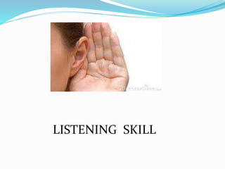 This document discusses the importance of listening skills. It defines listening as the ability to accurately receive and interpret messages. There are three basic steps to real listening: hearing what is said, understanding it, and judging if it makes sense. Different types of listening include casual, focused, intensive, and extensive. The document provides tips for being a good listener such as giving full attention, letting the speaker finish before responding, listening for main ideas, asking questions, and giving feedback. It also discusses how to teach listening skills, such as recognizing the effort required, actively interpreting what is heard, employing strategies to identify sounds and meanings, and providing authentic practice opportunities.