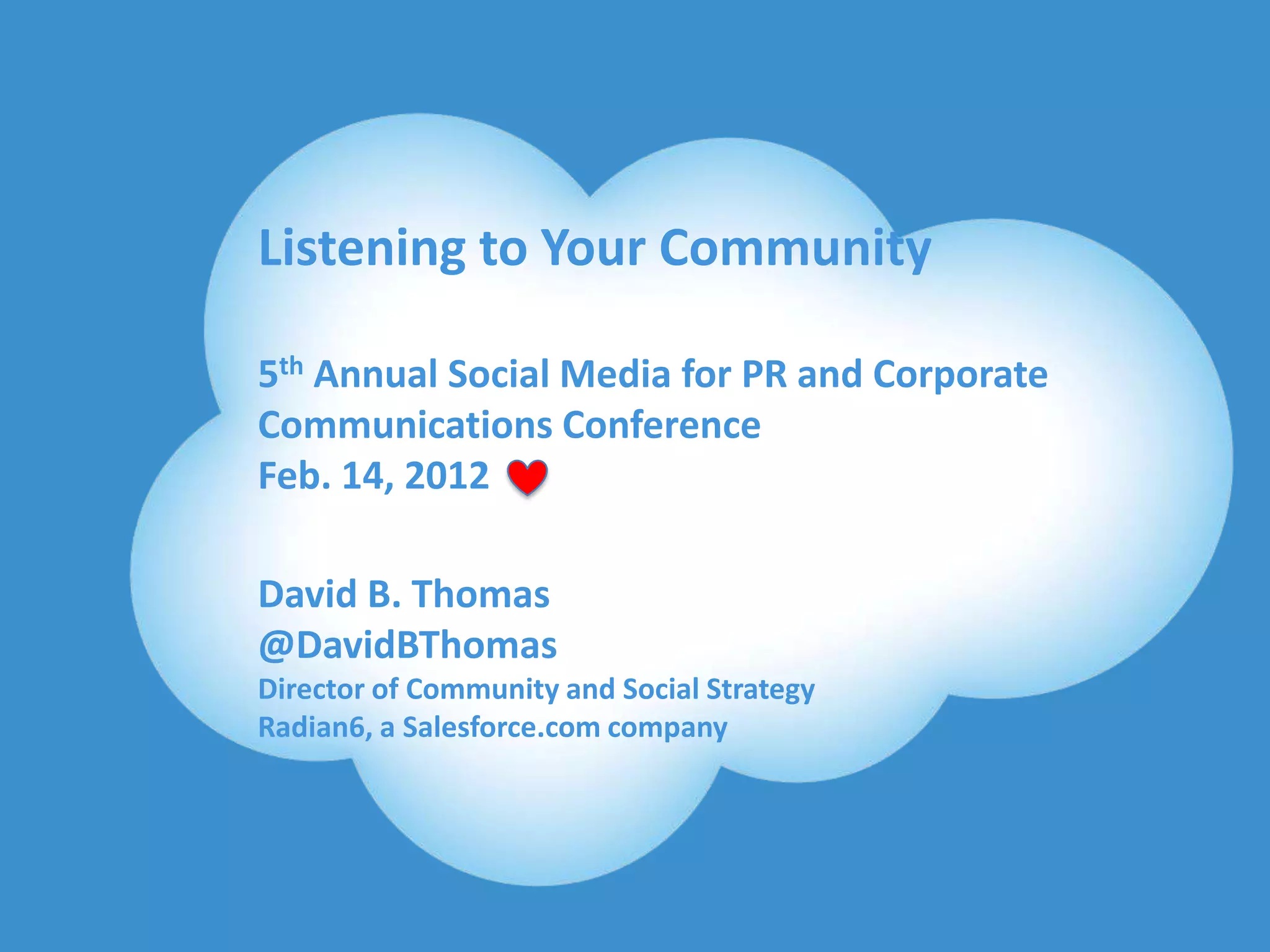 The document discusses David B. Thomas's presentation on listening to communities and building social media engagement. Some key points: