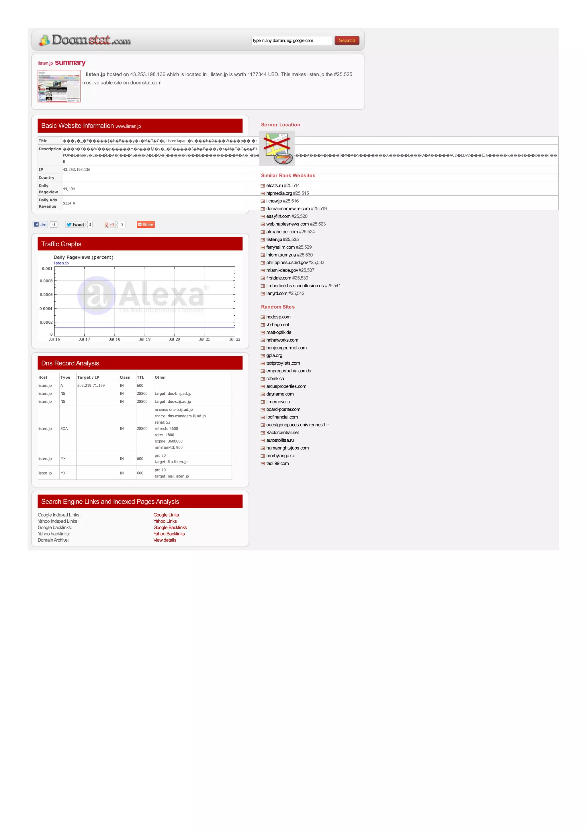 Listen.jp is a Japanese music streaming website hosted at IP address 43.253.198.136 located in Japan. The site is worth an estimated $1,177,344 and receives around 44,404 daily pageviews and $134.40 in daily ad revenue, ranking it as the #25,525 most valuable site according to doomstat.com. The site's DNS records show it uses iij.ad.jp nameservers and has MX records pointing to mail.listen.jp and ftp.listen.jp for email and FTP services.