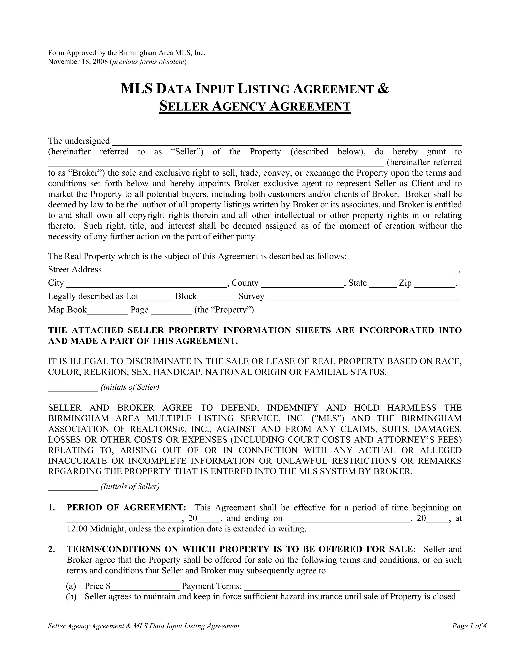 This document summarizes a listing agreement between a seller and broker. It grants the broker the exclusive right to sell the seller's property located at a specific address. It outlines the terms of the agreement, including the listing period, price, and marketing plan. It also specifies that the broker will receive a commission if the property is sold during the listing period to anyone shown the property by the broker or seller.