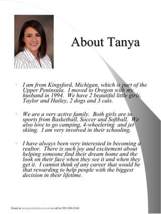 Tanya Peterson is a real estate agent with John L. Scott in Oregon. She provides her contact information and background, stating she has always been interested in real estate. She outlines her mission is to keep clients' goals in mind while providing professional services. She then discusses marketing strategies, home valuation, and the process after an offer is accepted.