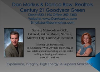 This document summarizes the real estate services offered by Dan Markus of Century 21 Goodyear Green. It highlights his 20+ years of experience in real estate and customer-focused philosophy. His team provides full marketing packages for listings, including MLS, website placement, open houses and more. They leverage the Century 21 brand and global referral network for additional exposure. Technology like virtual tours and neighborhood profiles are utilized to attract buyers online.