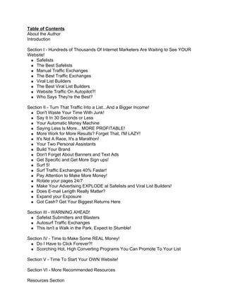 This document introduces List Recon, a product that teaches how to generate website traffic through free methods like safelists, traffic exchanges, and viral list builders. It explains how each traffic method works, providing examples of the top-performing options for each. The goal is to use these free traffic sources to build an email list and promote high-converting programs to generate online income without needing skills or money to start. Basic instructions are provided, with more details covered in subsequent sections. Legal disclaimers note that earnings are not guaranteed.
