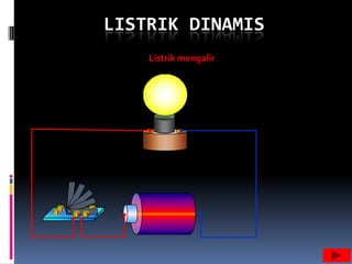 Dokumen ini menjelaskan konsep dasar arus listrik, termasuk definisi arus, arah aliran muatan, dan syarat-syarat agar arus listrik dapat mengalir dalam rangkaian. Terdapat dua jenis arus listrik, yaitu arus searah (DC) dan arus bolak-balik (AC), dengan penjelasan tentang sifat dan aplikasi masing-masing. Selain itu, dijelaskan juga mengenai alat ukur arus dan beda potensial serta faktor-faktor yang mempengaruhi hambatan pada kawat penghantar.