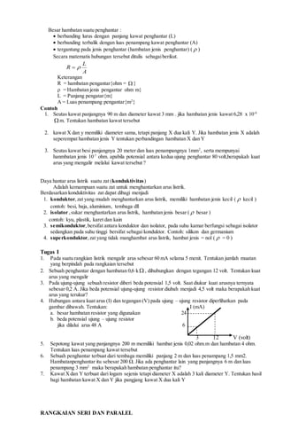 Dokumen ini membahas konsep dasar listrik dinamis, termasuk arus listrik, beda potensial, dan hambatan listrik. Terdapat penjelasan mengenai hukum Ohm, pengukuran arus dan tegangan, serta karakteristik konduktor, isolator, dan semikonduktor. Selain itu, dokumen ini juga menyentuh tentang rangkaian seri dan paralel serta penggunaan alat ukur listrik seperti multimeter, voltmeter, dan amperemeter.