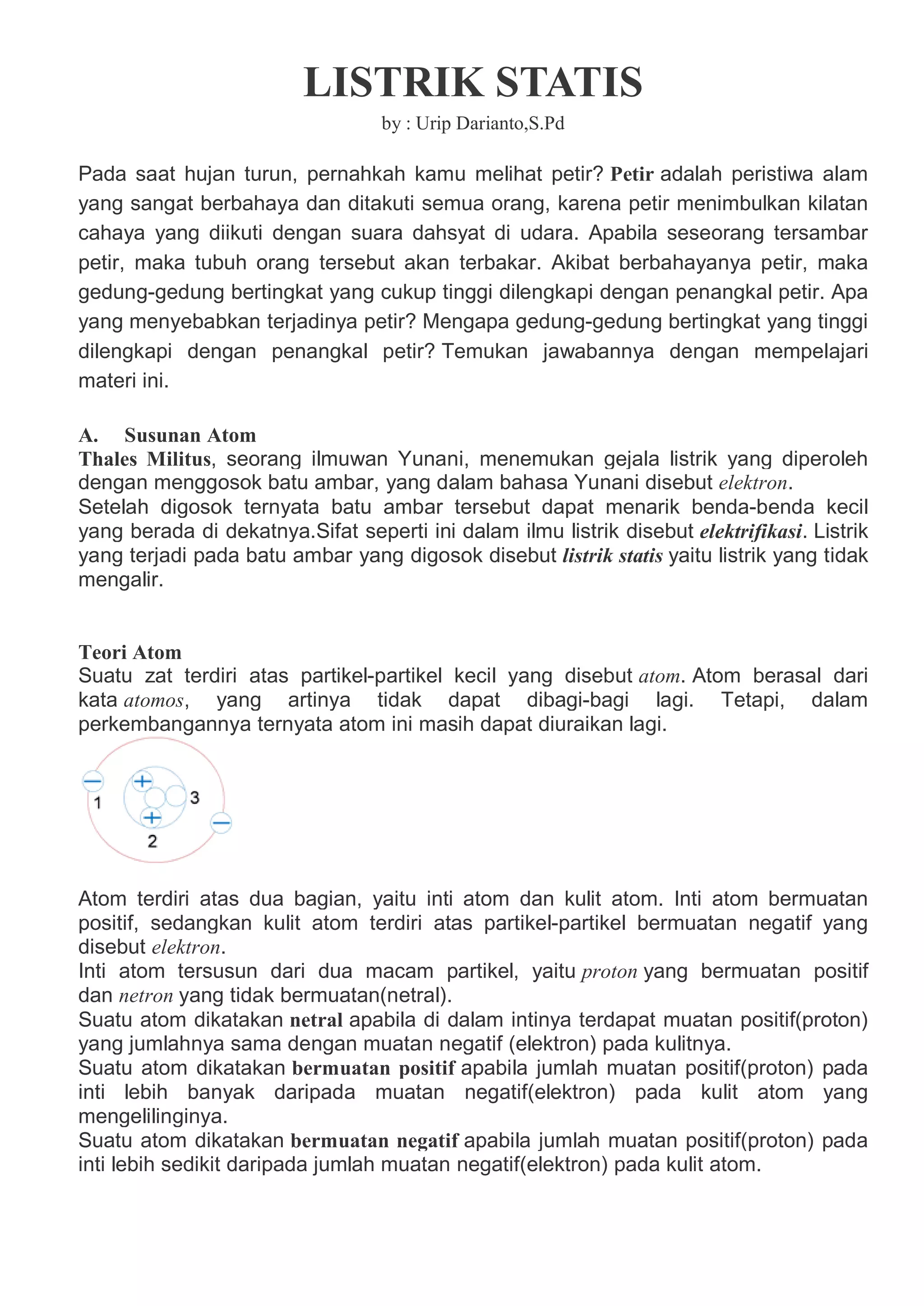 Dokumen ini menjelaskan konsep listrik statis, sumber dan sifat petir, serta teori atom termasuk partikel pembentuknya. Selain itu, membahas hukum Coulomb yang berkaitan dengan gaya listrik antara muatan dan fenomena induksi listrik. Informasi tentang berbagai bahan yang menghasilkan muatan listrik juga disertakan dalam konteks interaksi listrik.